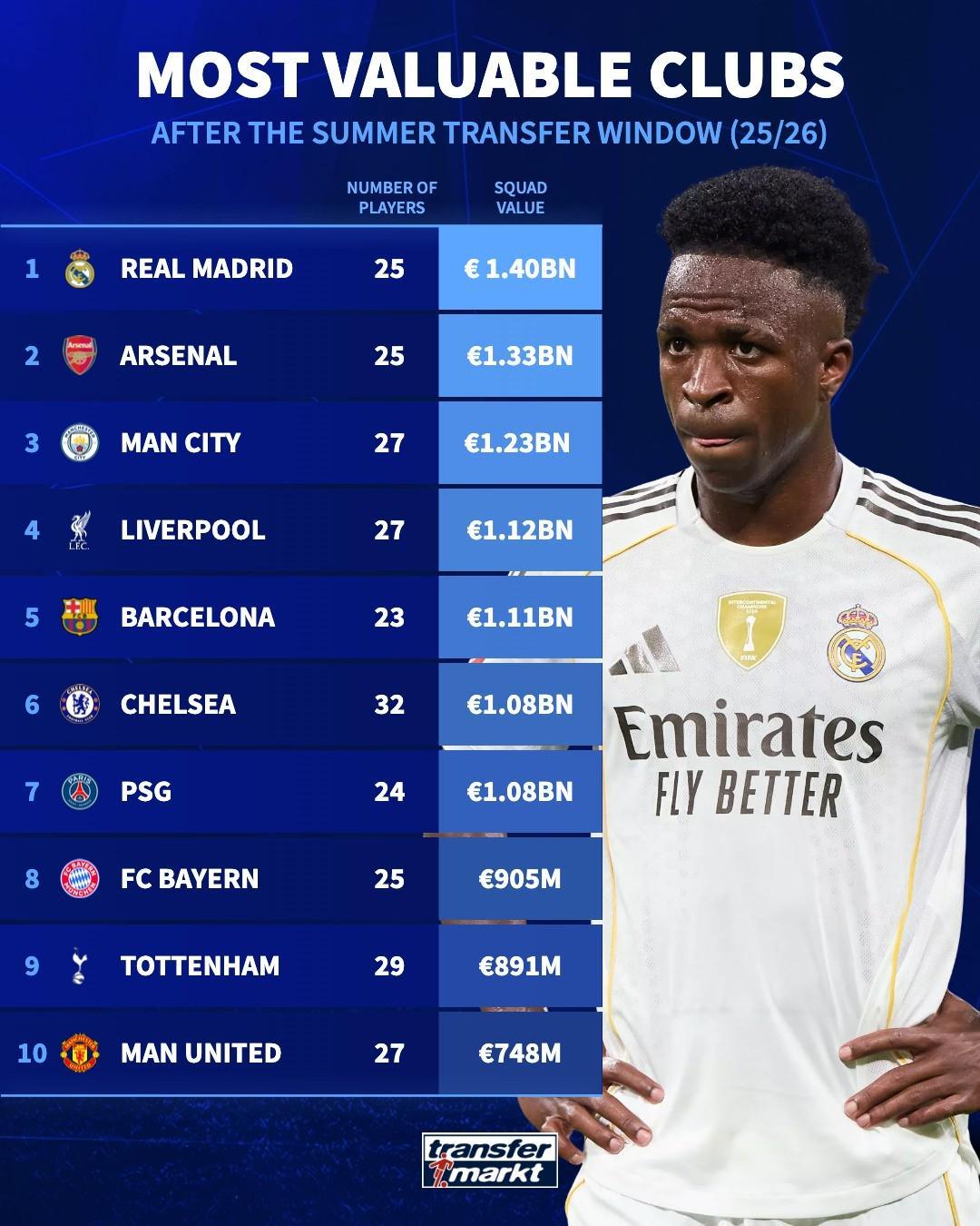 北京时间9月3日,德国转会市场发布2025/26赛季夏季转会窗口结束后最贵阵容榜单,皇马14亿欧元居首,阿森纳13.3亿欧位居次席,曼城12.3亿欧位列第三。