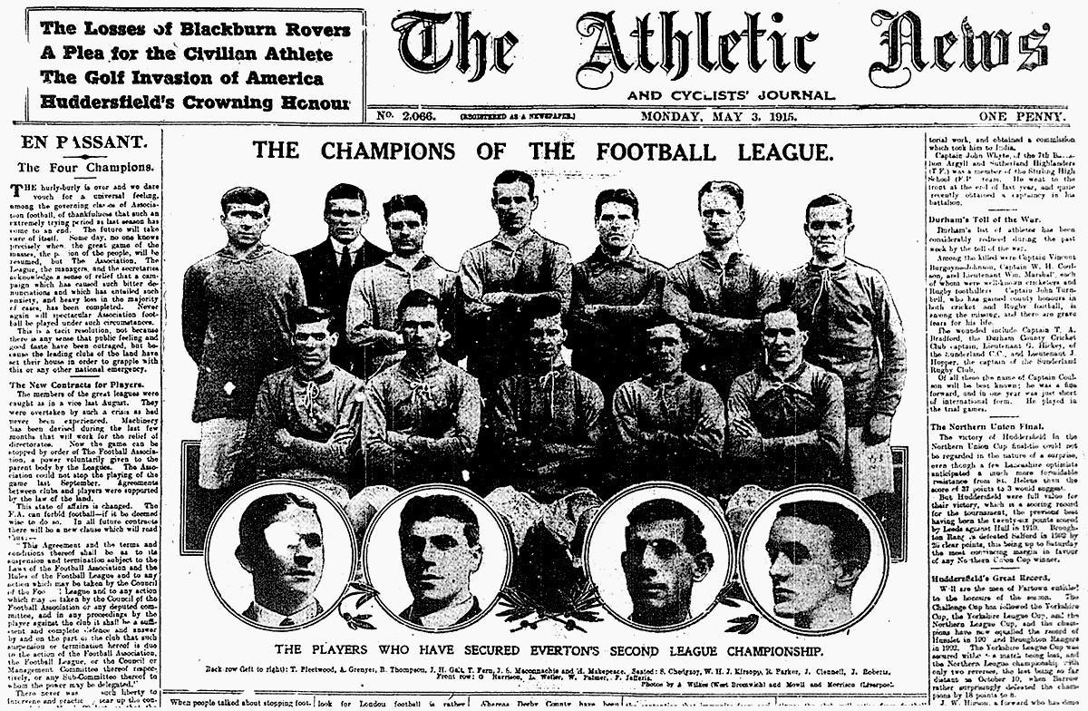 到了1915年年初,观众人数大幅滑落,球会收入骤减,少数未上战场的职业球员薪资也不得不削减。军队征用铁路使得前往客场出赛难上加难,军需工厂每个星期又带走更多人力。足球联赛咬牙苦撑,最终埃弗顿拿下冠军。谢菲尔德联和切尔西踢完了该赛季最后一战,也是大战期间最后一场比赛——足总杯决赛。