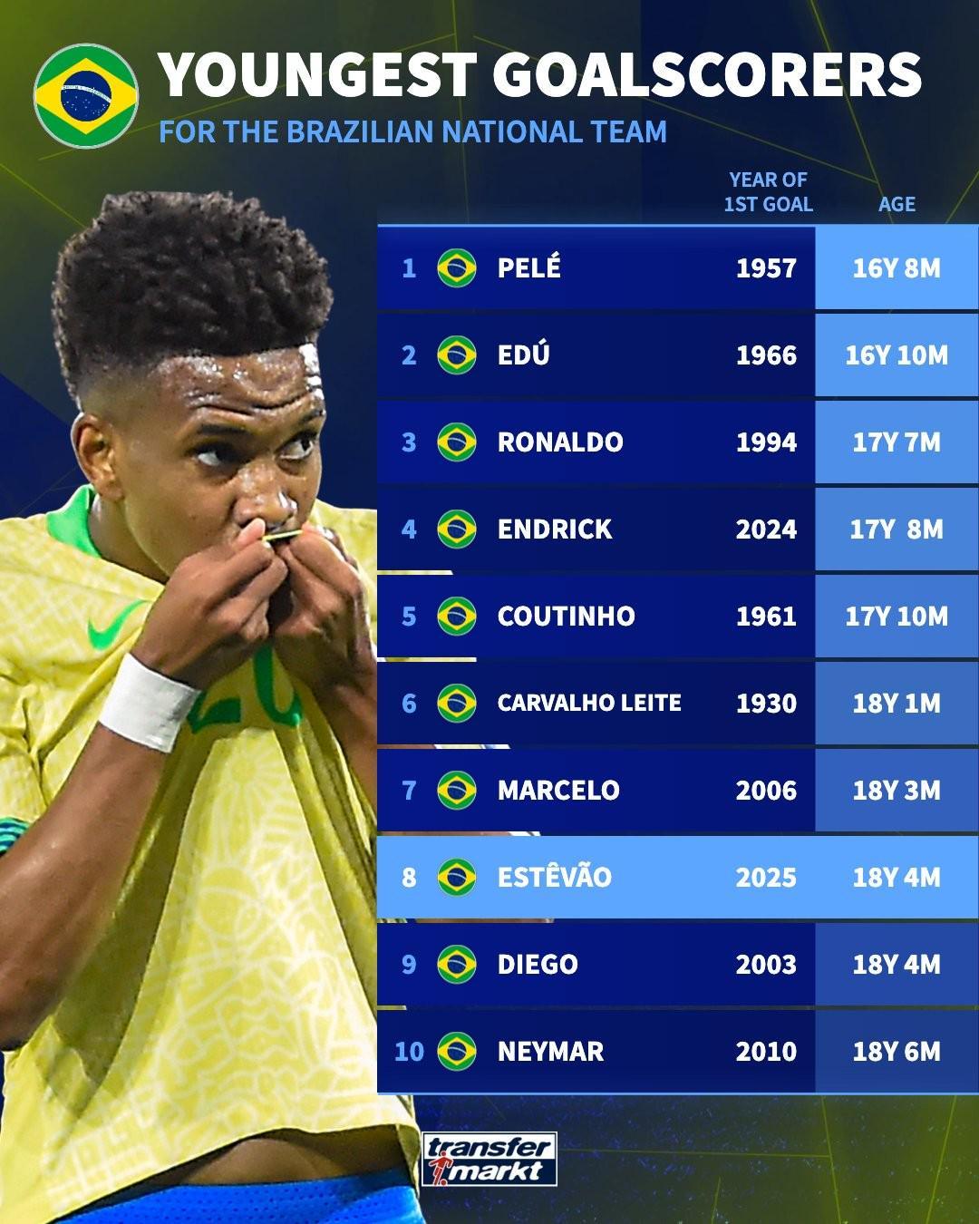 根据德转的数据,埃斯特旺以18岁4个月的年纪成为巴西国家队历史上第八年轻进球的球员。
