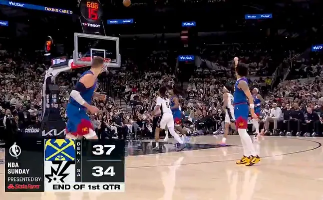 第一节比赛中,约基奇打满12分钟拿到12分7篮板,掘金首节37-34领先马刺。